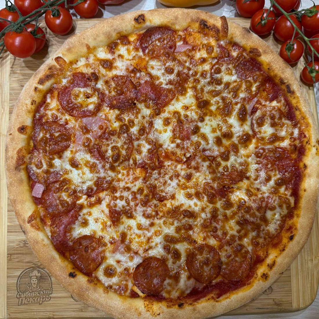 Томатный соус, куриное филе, ветчина, пепперони, острые колбаски чоризо, моцарелла
